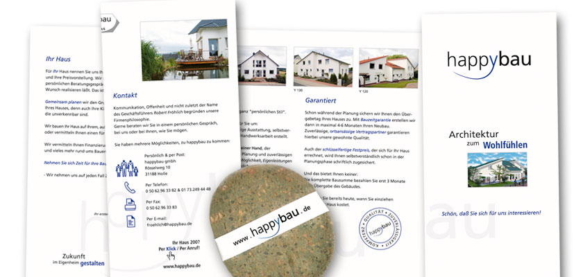 Signetentwicklung, Key Visual, typografische Konzeption, Geschäftsausstattung, Fotografie, Anzeigen, Plakate, Displays, Außenwerbung, Informationsstand, Internet-Auftritt (archiviert) happybau.de
