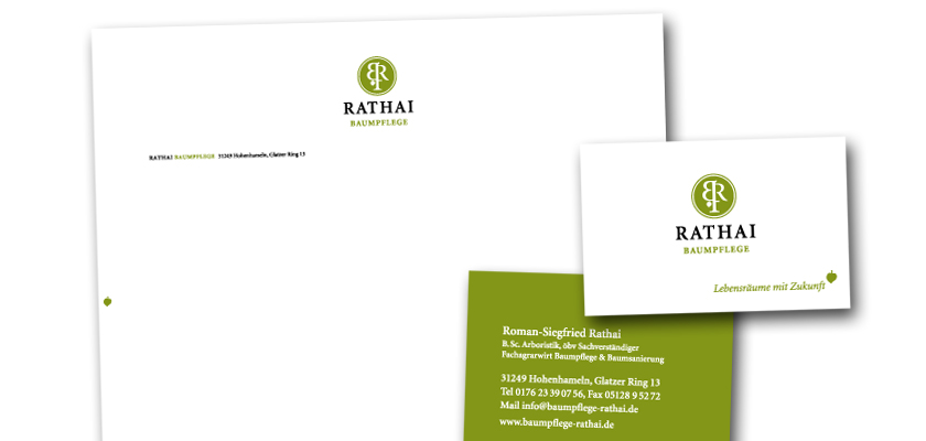 Signetentwicklung, typografische Konzeption, Geschäftsausstattung, Texterstellung, Fotografie, Broschüre, Anzeigen, Fahrzeugbeschriftung, Außenbeschilderung, Internet-Auftritt www.baumpflege-rathai.de