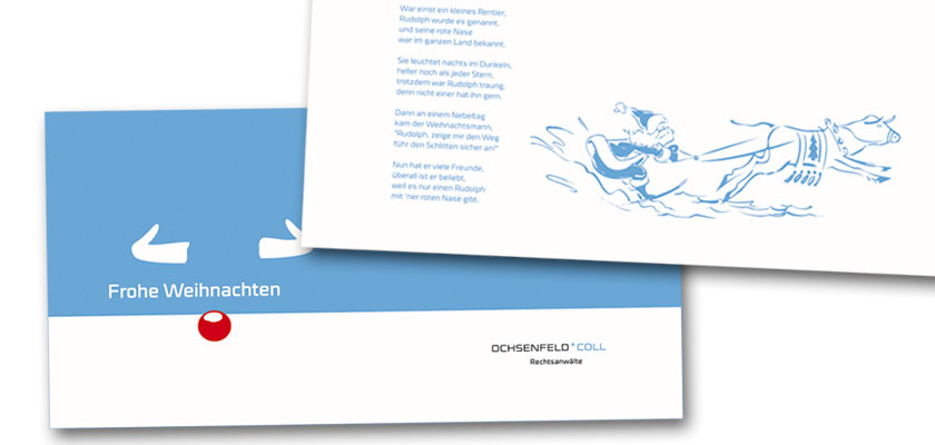 Die Kanzlei Ochsenfeld+Coll Rechtsanwälte betreut als kompetenter, seriöser Partner schwerpunktmäßig Unternehmen und Selbständige. Dem entspricht das Corporate Design: Die FF Cube von Jan Maack, eine kraftvolle, sachliche, aber dennoch nicht gänzlich unemotionale Schriftart, findet hier ihre Verwendung in der Wort-Marke als auch im Fließtext; zudem sorgt der auf nahezu allen Medien abgebildetete Stier, in Kombination mit der Hausfarbe Fernblau, für einen hohen Wiedererkennungswert.